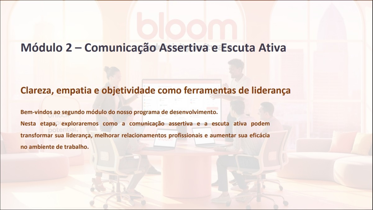 O objetivo deste treinamento é transformar a forma como você se comunica, adota posturas e exerce influência no seu dia a dia de trabalho. Em uma instituição financeira que valoriza o investimento nas pessoas, reconhecer e potencializar o talento feminino é fundamental para o nosso crescimento. Este curso demonstrará que o empoderamento não se trata de falar mais alto, mas sim de saber exatamente quando, como e por que se posicionar.